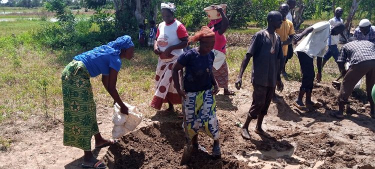 Une vingtaine de femmes dont Afatime, comme l’appellent ses voisines maraîchères, ont le nez qui côtoie la gadoue. Elles prêtent la main à l’effort de reconstruction de la digue « tondue » ; se chargeant de creuser la terre libérée avec le repli provisoire de l’eau. Munies d’ustensiles, de sacs vides, de pelles, et de quoi excaver le sol, ces « braves dames » du village de Konioudou sont aux côtés de la cinquantaine d’hommes depuis 7h du matin.