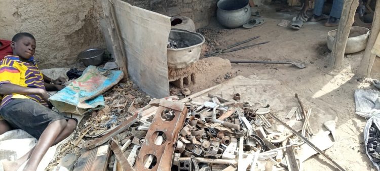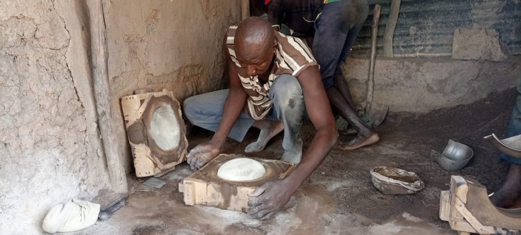 C’est sous une cabane d’au moins trois tôles et demie, clôturée de tôles, bénéficiant de l’ombrage d’un karité que Jean-Pierre et ses employés et apprentis travaillent. Il fait chaud dans ce lieu, surtout lorsque le soleil s’en mêle. En fait, le feu utilisé pour fondre l’aluminium dégage une forte chaleur.