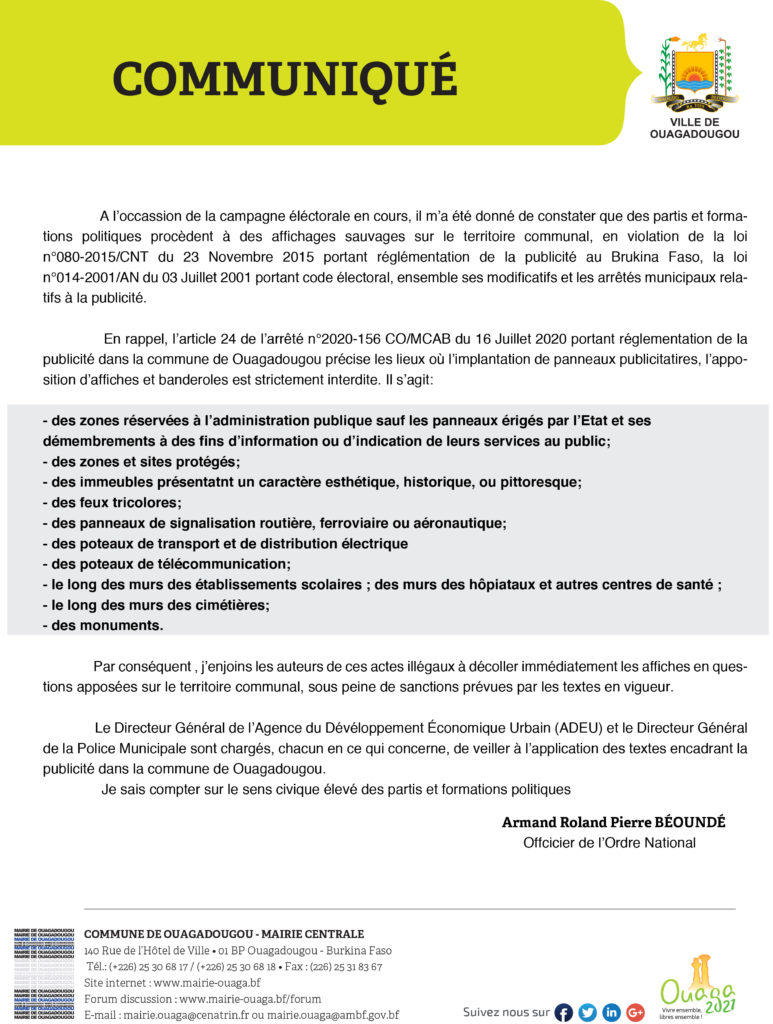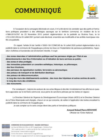 Accueil/Actualité/communiqués de presse/Réaction du Maire de la ville de Ouagadougou au sujet des affichages sauvages des partis et formations politiques sur le territoire Réaction du Maire de la ville de Ouagadougou au sujet des affichages sauvages des partis et formations politiques sur le territoire Webmaster B24 Envoyer un courriel 02/11/20200 Moins d’une minute Partage Webmaster B24 Envoyer un courriel 02/11/20200 Moins d’une minute Linkedin Messenger Messenger WhatsApp Telegram Partager par email Imprimer