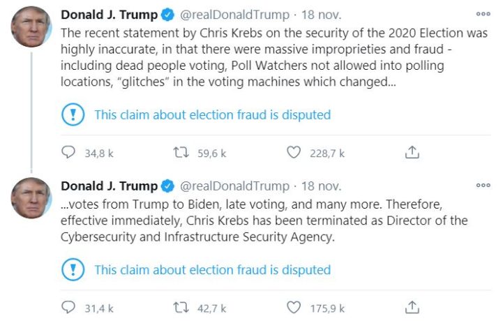 « La récente déclaration de Chris Krebs sur la sécurité de l’élection de 2020 était très inexacte, en ce sens qu’il y avait des irrégularités et des fraudes massives – y compris des personnes décédées votant, des observateurs de vote interdits dans les bureaux de vote, des «problèmes» dans les machines à voter qui ont changé des votes de Trump à Biden, des votes tardifs et bien d’autres. Par conséquent, avec effet immédiat, Chris Krebs a été licencié en tant que directeur de la Cybersecurity and Infrastructure Security Agency », a tweeté le Président américain sortant.