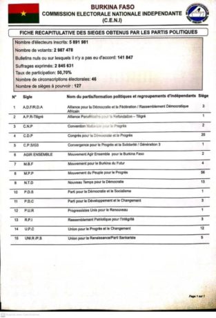 A noter que 2 987 478 Burkinabè ont voté à ces législatives pour un taux de participation de 50,70%.