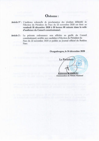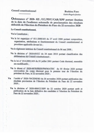 Accueil/Actualité/communiqués de presse/Conseil Constitutionnel: Ordonnance n° 2020-021/CC/PDT/CAB/EPF portant fixation de la date de l’audience solennelle de proclamation des résultats définitifs de de l’élection du Président du Faso du 22 novembre 2020 Conseil Constitutionnel: Ordonnance n° 2020-021/CC/PDT/CAB/EPF portant fixation de la date de l’audience solennelle de proclamation des résultats définitifs de de l’élection du Président du Faso du 22 novembre 2020 Webmaster B24 Envoyer un courriel 15/12/20200 Moins d’une minute Partage Webmaster B24 Envoyer un courriel 15/12/20200 Moins d’une minute Linkedin Messenger Messenger WhatsApp Telegram Partager par email Imprimer