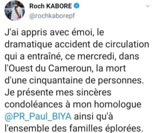 « J’ai appris avec émoi, le dramatique accident de circulation qui a entraîné, ce mercredi, dans l’Ouest du Cameroun, la mort d’une cinquantaine de personnes. Je présente mes sincères condoléances à mon homologue Paul Biya ainsi qu’à l’ensemble des familles éplorées». Tel est le tweet écrit par le Président du Faso au Président Paul Biya du Cameroun.
