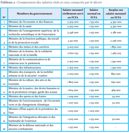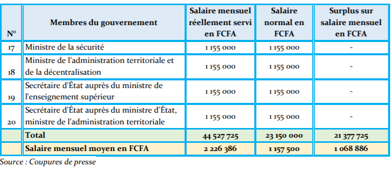 De cette analyse, le CFOEB fait ressortir que le coût salarial mensuel du gouvernement DABIRE II sera de 39 573 000 FCFA si le décret est respecté. Dans le cas contraire, ce coût serait de 75 915 133 FCFA si l’on tient compte du salaire mensuel moyen servi aux membres des gouvernements antérieurs. Des deux (02) informations, un écart mensuel de 36 342 133 FCFA se dégagerait, soit un écart annuel de 436 105 590 FCFA.