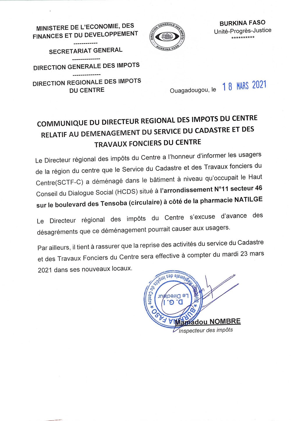 Communiqué: Démenagement cadastre et travaux foncier du centre