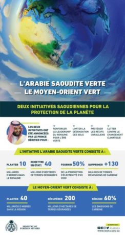 La déclaration du 27 mars 2021, du Prince Muhammad Ben Salman, Prince Héritier et  Vice-Président du Conseil des Ministres du Royaume d’Arabie Saoudite a indiqué que le Royaume entend unir les efforts et commencer à travailler avec les pays amis pour l’atteinte de ses objectifs. A long terme, le Royaume veut porter la part de ses énergies propres de 0,3% à 50% à l’horizon 2030.