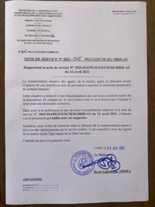« Suite à la polémique et aux diverses interprétations à la note de service du 12 avril 2021, j’informe tout le personnel que ladite note est rapportée », a décidé le maire de la commune du Golfe 5 du Togo Aboka Kossi Abenvega dans une note de service signée le mercredi 14 avril 2021.