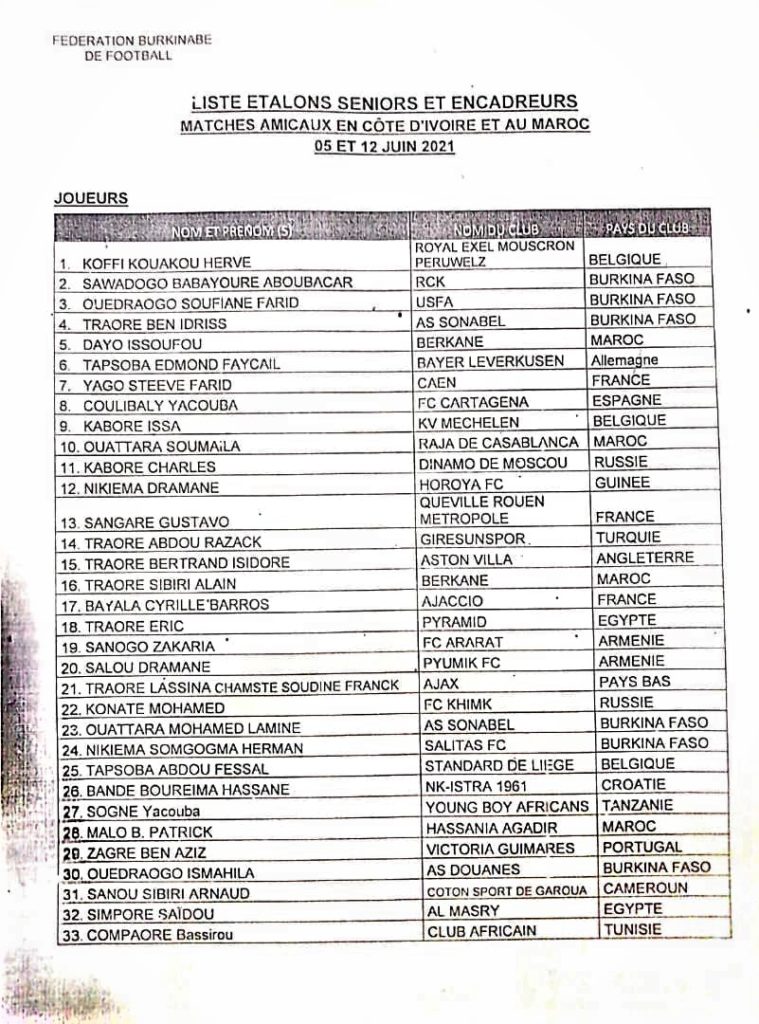 Le sélectionneur des Etalons du Burkina Faso Kamou Malo a livré la liste des joueurs retenus pour affronter les Eléphants de Côte d’Ivoire et les Lions de l’Atlas du Maroc en matchs amicaux le mercredi 19 mai 2021 à Ouagadougou. Ces deux rencontres entrent dans le cadre des éliminatoires de la Coupe du Monde 2022 prévues au Qatar.