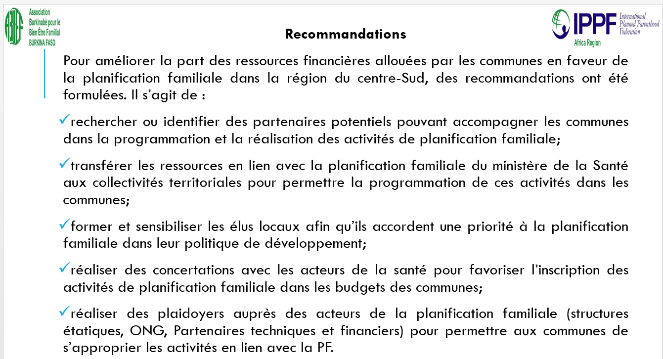 C’est pour disposer de données sur le niveau d’allocation des ressources financières en faveur de la planification familiale que l’ABBEF a décidé réaliser une étude, avec l’appui des directions régionales de l’économie et de la planification des régions du Centre-Sud et du Centre-Ouest.