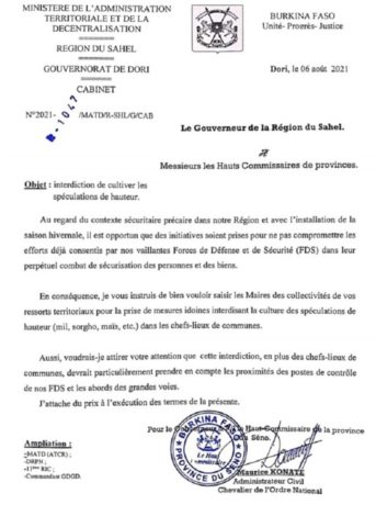 Au regard du contexte sécuritaire dans le Sahel et avec l’installation de la saison hivernale, les autorités ont décidé de l’interdiction de la culture des spéculations de hauteur notamment le mil, le sorgho, le maïs, etc. dans les Chefs-lieux de Communes, mais surtout à proximité de tout poste de contrôles des Forces de défense et de sécurité et dans les abords des grandes voies.