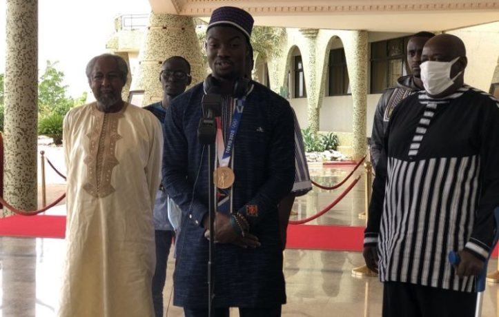 Hugues Fabrice Zango a été reçu ce jeudi 12 août 2021 par le président du Faso à Kossyam. Il s’est agi pour lui de présenter sa médaille de bronze des jeux olympiques de Tokyo 2020, obtenue le 5 août 2021 et de remercier le Chef de l’Etat pour son soutien.