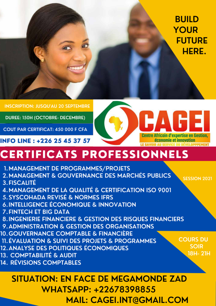 Le Centre Africain d’Expertise en Gestion, Économie et Innovation (CAGEI) informe le public de l’ouverture, pour le compte de la dernière session 2021, des inscriptions pour le recrutement des certificats de qualification professionnelle en Intelligence Économique & Innovation (IEI).