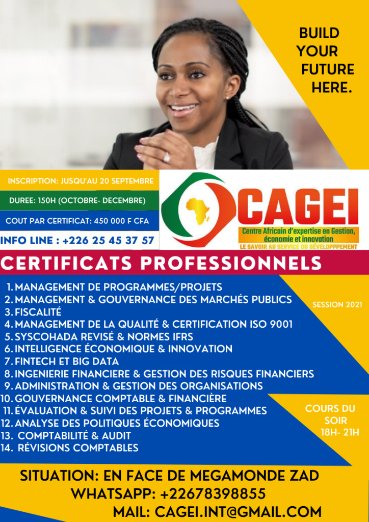 Le Centre Africain d’Expertise en Gestion, Économie et Innovation (CAGEI) informe le public de l’ouverture, pour le compte de la dernière session 2021, des inscriptions pour le recrutement des certificats de qualification professionnelle en Management et Gouvernance de Projets et Programmes (MGP).