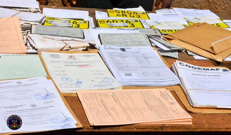 Au cours de l’interpellation des membres du réseau par la Brigade de Recherches du Commissariat de Police de l’Arrondissement de Sig-Noghin, il a été trouvé en leur possession plus d’une centaine de cachets contrefaits de plusieurs institutions, notamment la Police Nationale, la Gendarmerie Nationale, la Douane, la DGTTM et le Guichet Unique du Foncier (GUF), des carnets de fausses quittances et des fiches de déclaration de douane contrefaites, des récépissés de dépôt de dossiers d’immatriculation de véhicules, des certificats de conformité et d’évaluation de conformité de véhicules, des plaques d’immatriculation et des attestations de vente d’engins.