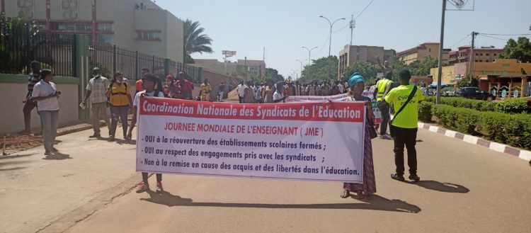 La marche-meeting de la coordination nationale des syndicats de l’éducation nationale (CNSE), de ce mardi 5 octobre 2021, en marge de la célébration de la journée mondiale de l’enseignant, s’est transformée en une marche silencieuse. Ce, en solidarité avec les Forces de défense et de sécurité suite à l’attaque contre le détachement militaire de Yirgou qui a fait 14 morts le lundi 4 octobre 2021 au petit matin.