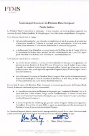 Dans ce communiqué relayé sur les réseaux sociaux, les avocats de Blaise Compaoré ont déclaré que leur client ne se rendra pas, et eux non plus, au « procès politique organisé à son encontre devant le Tribunal militaire de Ouagadougou c’est-à-dire devant une juridiction d’exception ».