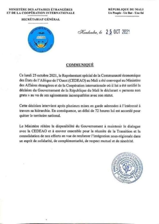 Mali : Le représentant spécial de la CEDEAO a 72h pour quitter le territoire