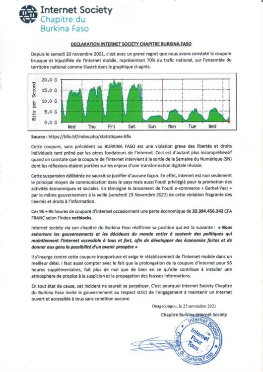 Internet society chapitre du Burkina Faso, dans une déclaration, en date de ce jeudi 25 novembre 2021, dénonce la coupure « brusque et injustifiée » de l’internet mobile au Burkina Faso depuis le samedi 20 novembre 2021.