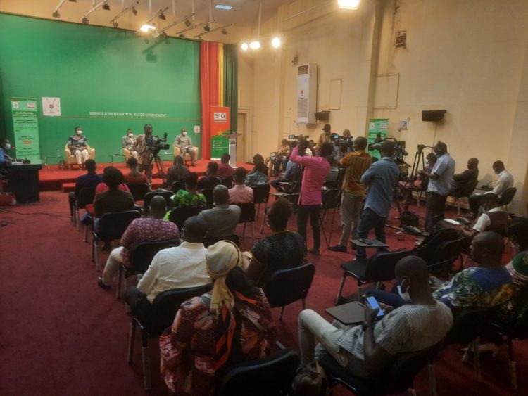 Le ministre en charge de la santé, Pr Charlemagne Ouédraogo, accompagné de son homologue en charge des transports, Vincent Dabilgou, a animé un point de presse relatifs à la situation actuelle de la pandémie de COVID-19, l’état des lieux de la Vaccination et le Dispositif sanitaire mis en place en accompagnement de la réouverture des frontières terrestres et ferroviaires, ce jeudi 2 décembre 2021.
