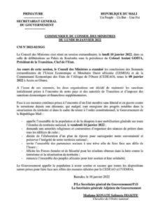 A l’issue de la session extraordinaire du conseil des ministres de ce lundi 10 janvier 2022, au palais de Koulouba, et sous la présidence du Colonel Assimi Goita, président de la transition, Chef de l’Etat, le gouvernement malien a décidé d’une batterie de mesures en vue de faire face « aux mesures extrêmes prises à l’encontre d’un Etat membre sans littoral et en guerre contre le terrorisme ».