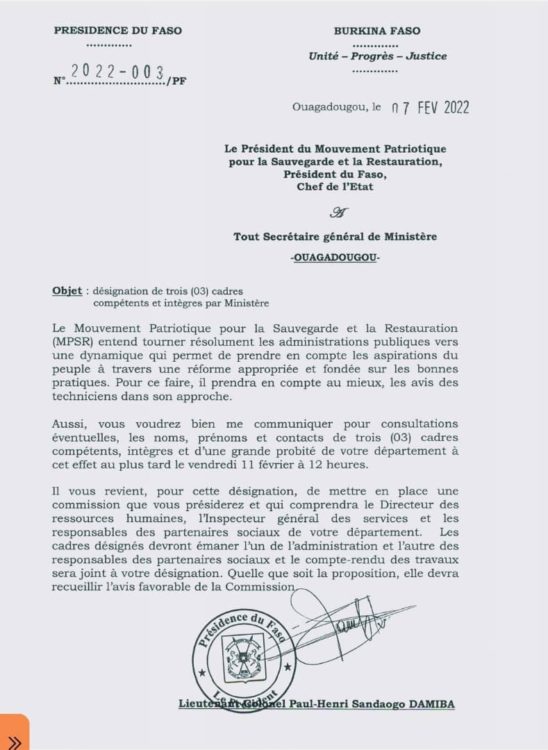Le Président du Mouvement Patriotique pour la Sauvegarde et la Restauration informe les Secrétaires généraux des Ministères de la désignation de trois (03) cadres compétents et intègres par Ministère.