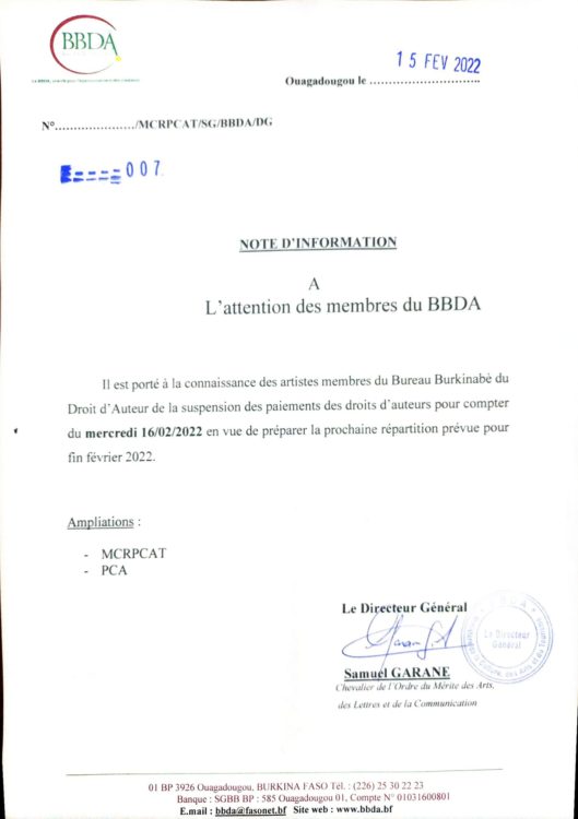 Le Directeur Général du Bureau Burkinabè du Droit d’Auteur (BBDA), Samuel GARANÉ, informe les artistes membres de la suspension des paiements des droits d’auteurs pour compter du mercredi 16/02/2022 en vue de préparer la prochaine répartition prévue pour fin février prochain.
