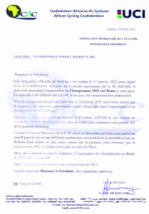 Le Burkina Faso n’organisera plus le Championnat d’Afrique de cyclisme 2022. La Confédération africaine de cyclisme (CAC) a donné l’information à la Fédération burkinabè de cyclisme (FBC).