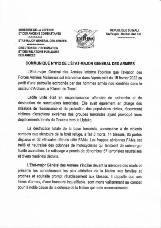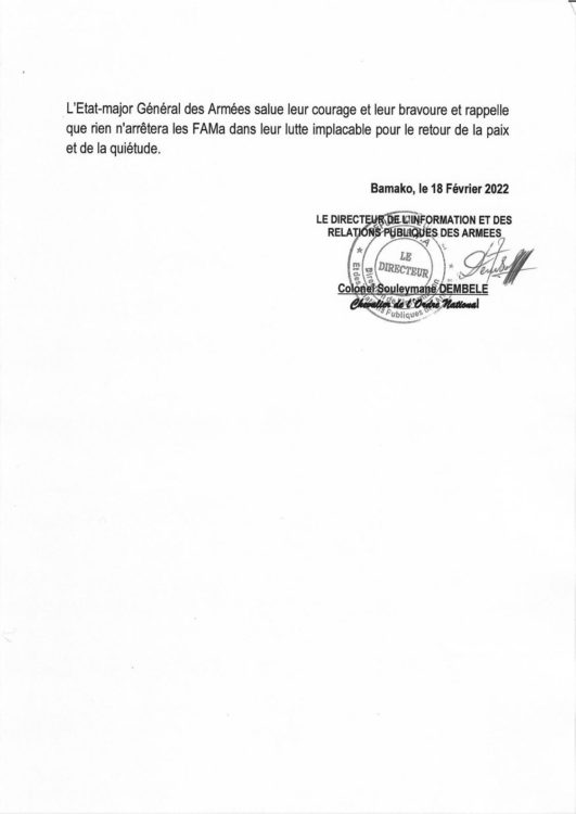 L’État-Major général des armées du Mali a annoncé que huit militaires maliens sont tombés et 14 autres blessés dans l’après-midi du 18 février 2022 suite à un accrochage avec des hommes armés.