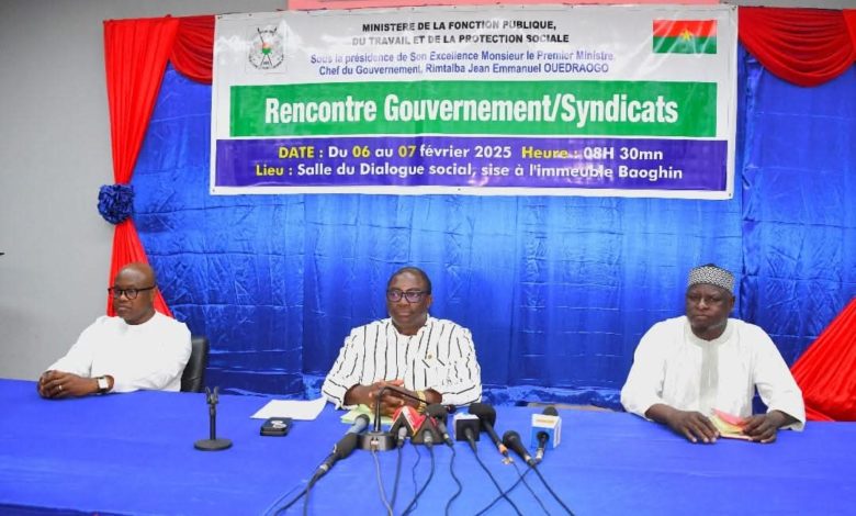 Les travaux de la rencontre Gouvernement/Syndicats se sont achevés, le vendredi 7 février 2025, à Ouagadougou, sous la présidence du ministre de la Fonction publique, du travail et de la Protection sociale, Mathias Traoré, représentant le Premier ministre, Rimtalba Jean Emmanuel Ouédraogo.