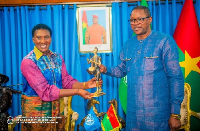 Après 5 ans passés au Burkina Faso, Aïssatou GUISSE KASPAR est en fin de mission, et est donc venue dire au revoir au Chef de la diplomatie burkinabè et à l’ensemble de ses collaborateurs. Elle a traduit sa reconnaissance au ministre en charge des Affaires étrangères et à l’ensemble des autorités du Burkina Faso, pour la bonne collaboration qui a prévalu durant son mandat, entre son institution et les différents départements ministériels.