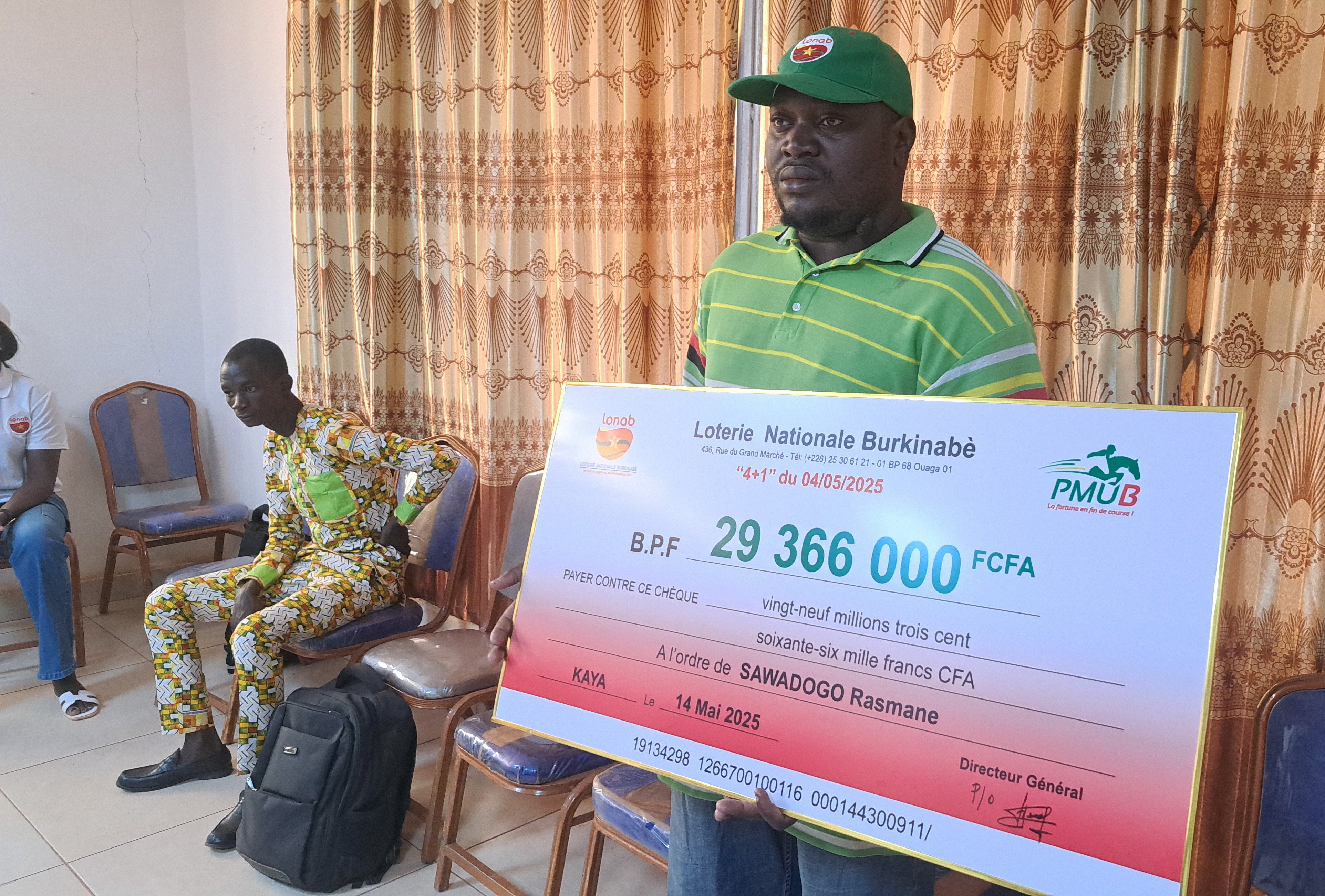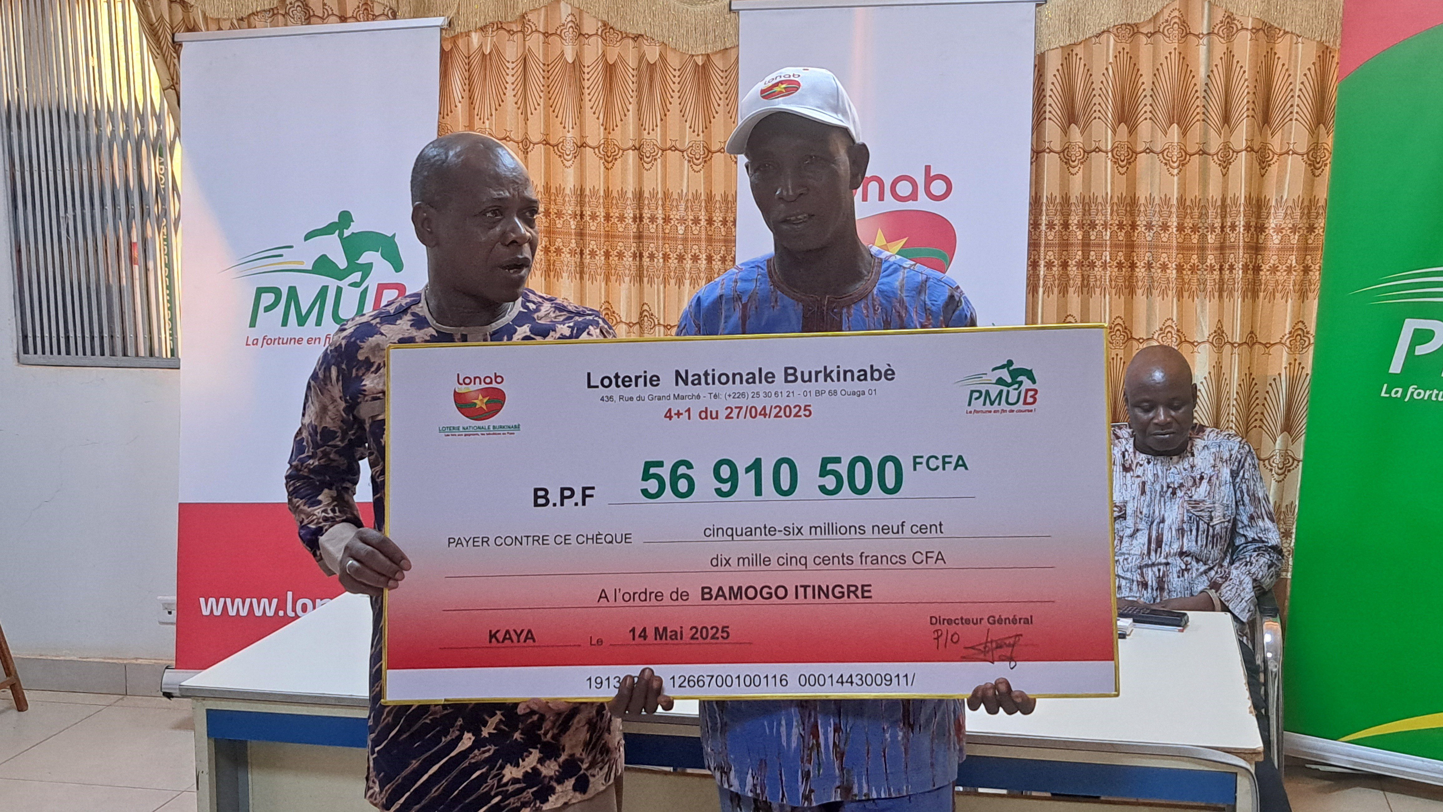 La Loterie Nationale Burkinabè (LONAB) a honoré deux de ses plus récents et chanceux gagnants du 4+1 PMU’B, le mercredi 14 mai 2025 à Kaya. Rasmané Sawadogo, mécanicien de profession, et Itingré Bamogo, cultivateur, ont reçu des chèques totalisant la somme impressionnante de 86 276 500 FCFA.