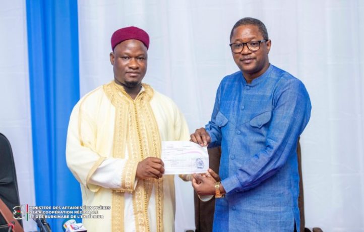 Le ministre des Affaires étrangères, de la Coopération régionale et des Burkinabè de l’Extérieur a reçu, le vendredi 16 mai 2025, une contribution à l’effort de paix, remise par un membre de la diaspora burkinabè vivant à Abuja (Nigeria), Ibrahim KOANDA.