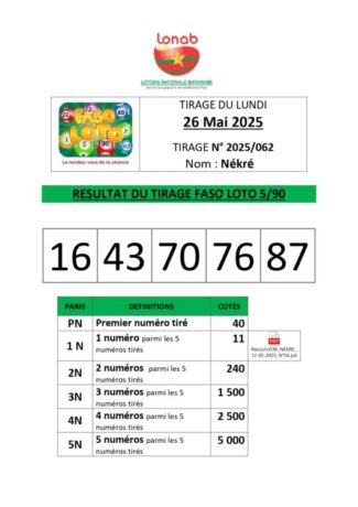 Accueil/Actualité/communiqués de presse/Communiqué | TIRAGE FASO LOTO 5/90 – Résultats du Tirage – Lundi 26 Mai 2025 Communiqué | TIRAGE FASO LOTO 5/90 – Résultats du Tirage – Lundi 26 Mai 2025 Webmaster B24 Envoyer un courriel 26/05/2025 Moins d’une minute Partage TIRAGE FASO LOTO 5/90 – Résultats du Tirage – Lundi 26 Mai 2025 Les numéros gagnants sont : 16 – 43 – 70 – 76 – 87 . Ne manquez pas le prochain tirage et saisissez votre chance de devenir gagnant ! Faso Loto, le rendez-vous de la chance ! Jeu interdit aux moins de 18 ans. ResLoto590_NEKRE_26-05-2025_N°62 Webmaster B24 Envoyer un courriel 26/05/2025 Moins d’une minute Linkedin Messenger Messenger WhatsApp Telegram Partager par email Imprimer