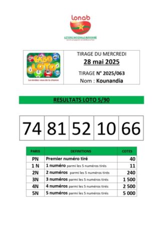 Accueil/Actualité/communiqués de presse/Communiqué | TIRAGE FASO LOTO 5/90 – Résultats du Tirage – Mercredi 28 mai 2025 Communiqué | TIRAGE FASO LOTO 5/90 – Résultats du Tirage – Mercredi 28 mai 2025 Webmaster B24 Envoyer un courriel 28/05/2025 Moins d’une minute TIRAGE FASO LOTO 5/90 – Résultats du Tirage – Mercredi 28 mai 2025 Les numéros gagnants sont : 74 – 81- 52 -10 – 66. Ne manquez pas le prochain tirage et saisissez votre chance de devenir gagnant ! Faso Loto, le rendez-vous de la chance ! Jeu interdit aux moins de 18 ans. ResLoto590_KOUNANDIA_28-05-2025_N°63 Webmaster B24 Envoyer un courriel 28/05/2025 Moins d’une minute Linkedin Messenger Messenger WhatsApp Telegram Partager par email Imprimer
