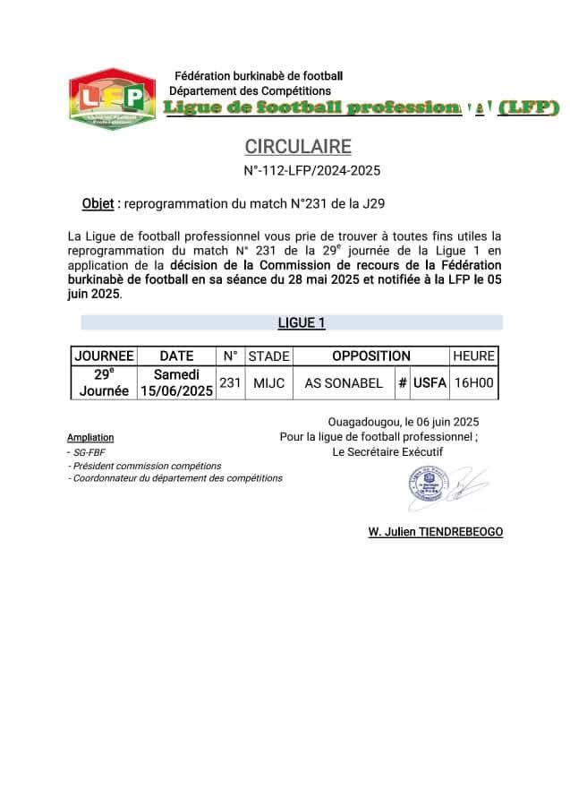 Après une annulation pour un incident de maillots identiques, le choc entre l’AS SONABEL et l’USFA avait été reprogrammée par la Ligue de Football Professionnel à travers un communiqué. Selon une note des électriciens, plusieurs de leurs joueurs sont libres de contrat.