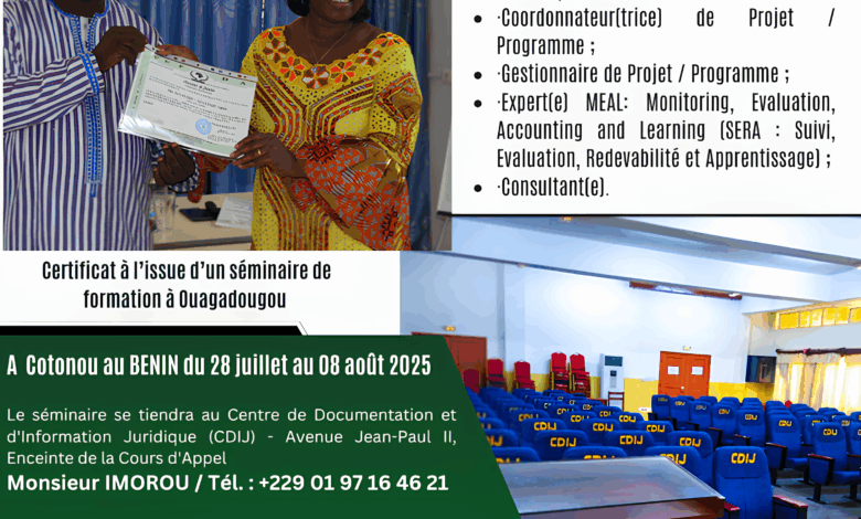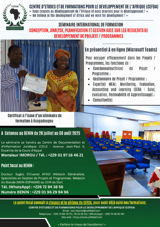 Accueil/Actualité/communiqués de presse/Communiqué | Séminaire International De Formation A Cotonou : Conception, Analyse, Planification Et Gestion Axée Sur Les Résultats De Développement De Projets / Programmes Communiqué | Séminaire International De Formation A Cotonou : Conception, Analyse, Planification Et Gestion Axée Sur Les Résultats De Développement De Projets / Programmes Webmaster B24 Envoyer un courriel 14/06/2025 Moins d’une minute PartageNE RATEZ PAS CETTE BELLE OPPORTUNITÉ ! Le CEFDA à COTONOU du 28 juillet au 08 août 2025 Webmaster B24 Envoyer un courriel 14/06/2025 Moins d’une minute Linkedin Messenger Messenger WhatsApp Telegram Partager par email Imprimer