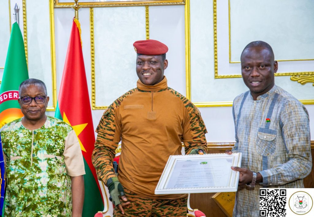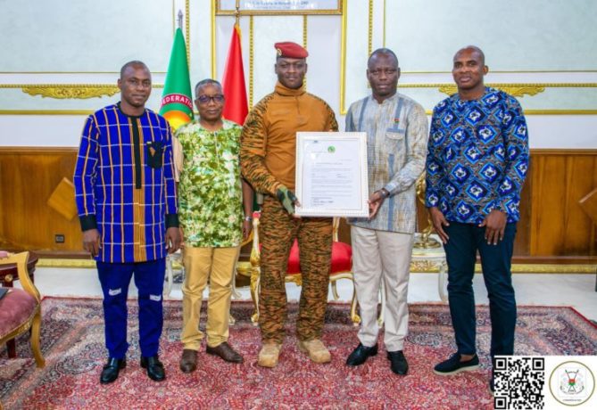 Le Président du Faso, Chef de l’État, le Capitaine Ibrahim TRAORÉ, a reçu ce vendredi 4 juillet 2025 en fin de matinée, le certificat d’homologation du Stade du 4-Août des mains du ministre des Sports, de la Jeunesse et de l’Emploi, M. Roland SOMDA.