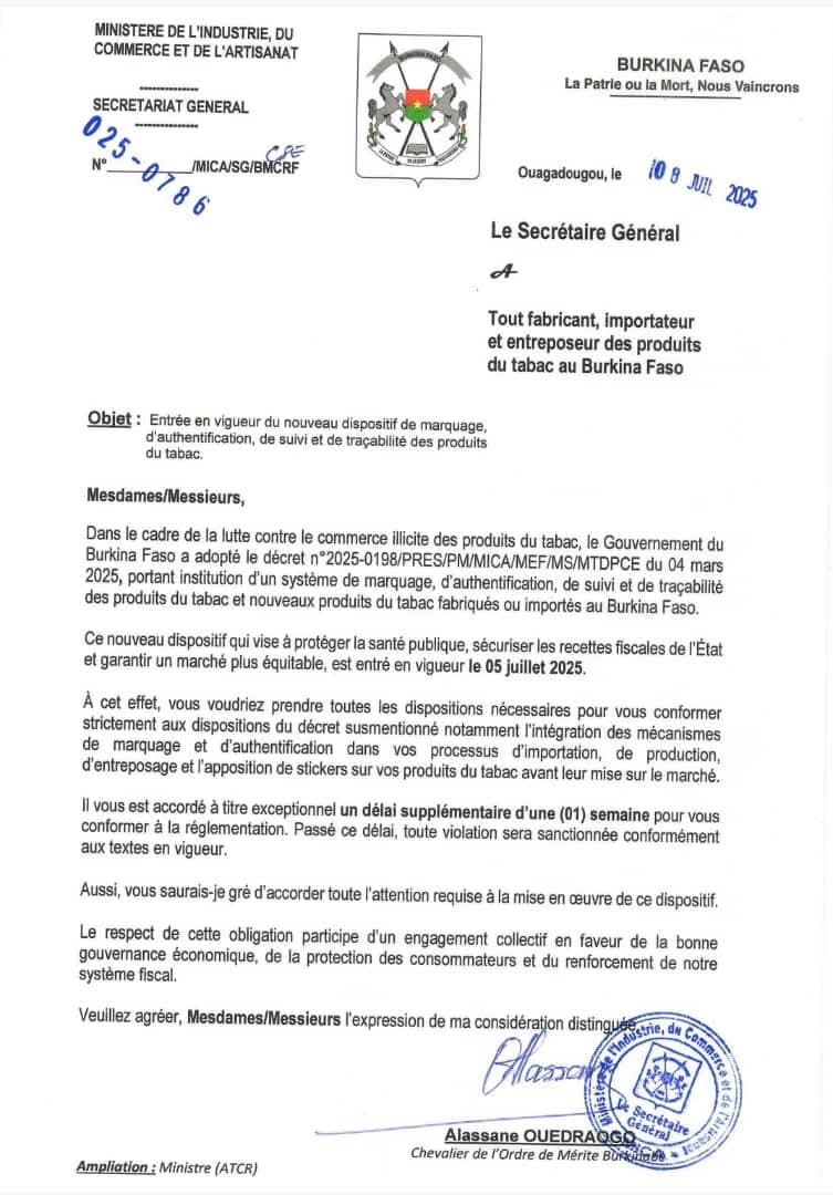 Formalisée par le décret n°2025-0198/PRES/PM/MICA/MEF/MS/MTDPCE du 4 mars 2025, cette initiative s’inscrit dans la stratégie nationale de lutte contre le commerce illicite de produits du tabac. Le 8 juillet 2025, une lettre officielle du Secrétariat Général du Ministère de l’Industrie, du Commerce et de l’Artisanat a été adressée à tous les fabricants, importateurs et entreposeurs de tabac du Burkina Faso, les informant de cette nouvelle obligation.