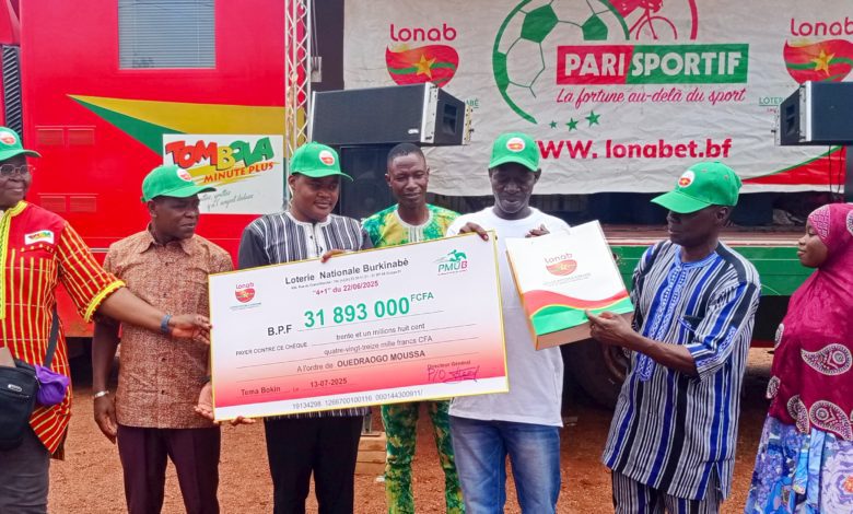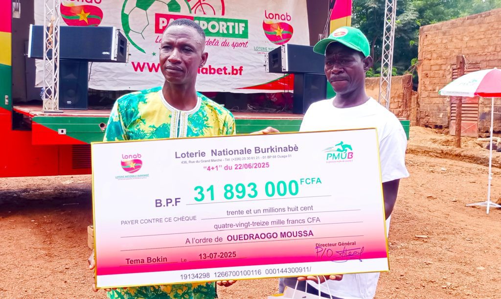 Moussa Ouédraogo, habitant de la commune de Téma Bokin, est entré en possession de son chèque de trente et un millions huit cent quatre-vingt-treize mille (31 893 000) Francs CFA émis par la Loterie Nationale Burkinabè (LONAB) pour le gain du 4+1 du 22 juin 2025. Il l’a symboliquement reçu des mains de Yamba Jean Zida, au nom du Directeur Général de la structure, le dimanche 13 juillet 2025.