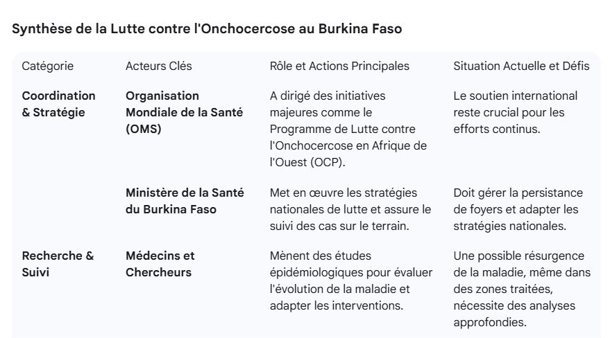 En effet, l’onchocercose, ou « cécité des rivières », a dévasté le Burkina Faso. Dans les années 1940-1960, elle a rendu inhabitables 250 000 km² de terres fertiles, avec jusqu’à 50% de cécité chez les hommes de plus de 40 ans dans les zones touchées, forçant des migrations massives, selon les chiffres du Programme de Lutte contre l’Onchocercose (OCP).