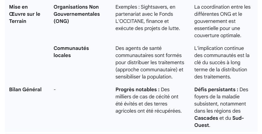 Au début des années 1970, on comptait 1 million de personnes infectées et 35 000 à 40 000 aveugles sur 6,4 millions d’habitants. Le lancement du Programme de Lutte contre l’Onchocercose (OCP) en 1974, avec la lutte antivectorielle et l’ivermectine (médicament antiparasitaire) dès la fin des années 1980, a été décisif.