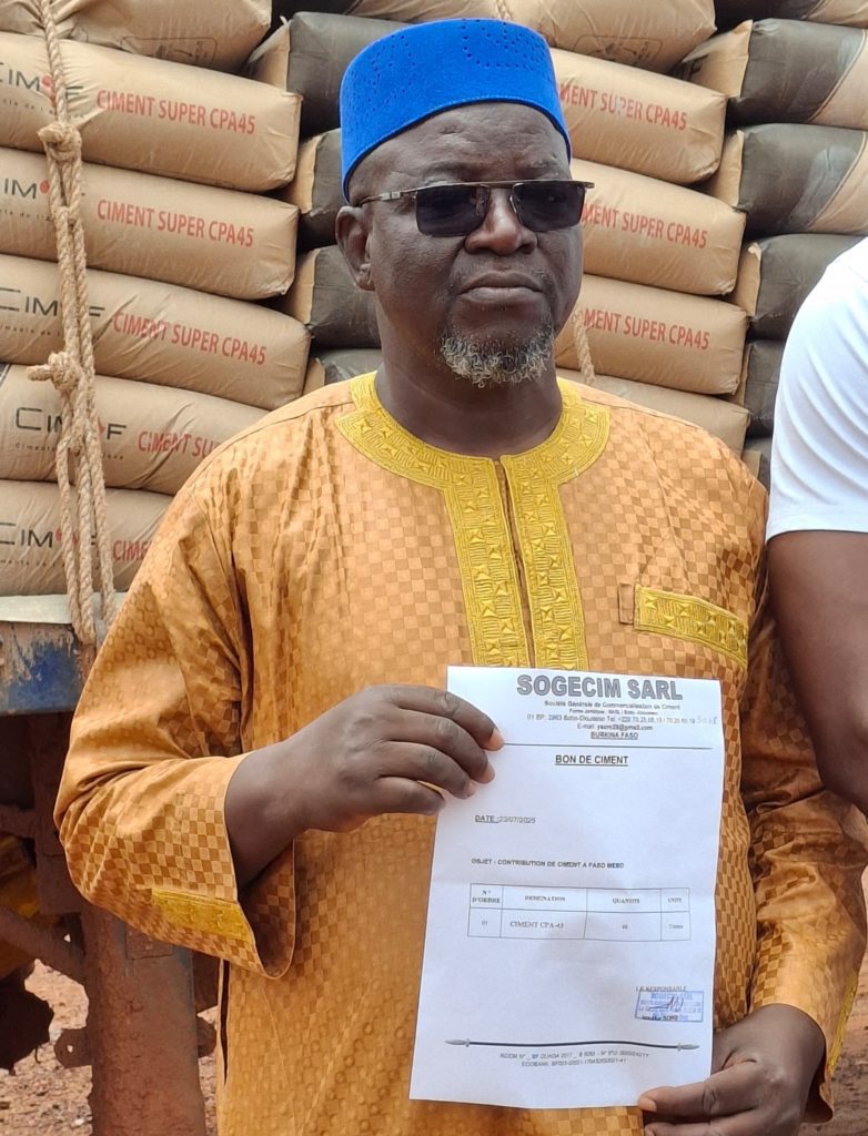 Deux grands grossistes de l’entreprise Ciments de l’Afrique (CIMAF), M. Siaka Soré et M. Abdoulaye Boulou, ont fait don de 80 tonnes de ciment, en guise de soutien à l’Initiative Faso Mêbo, lancée par le Chef de l’État, le Capitaine Ibrahim TRAORE. La remise de cette contribution a eu lieu le mercredi 23 juillet 2025, à Bobo-Dioulasso au quartier général de l’initiative.