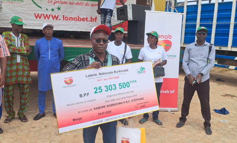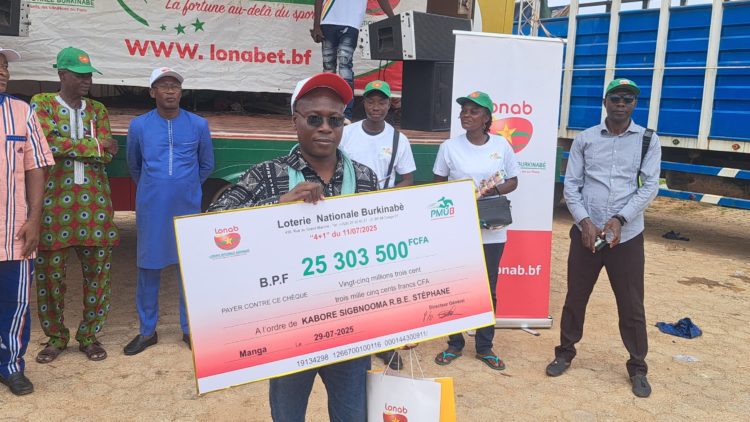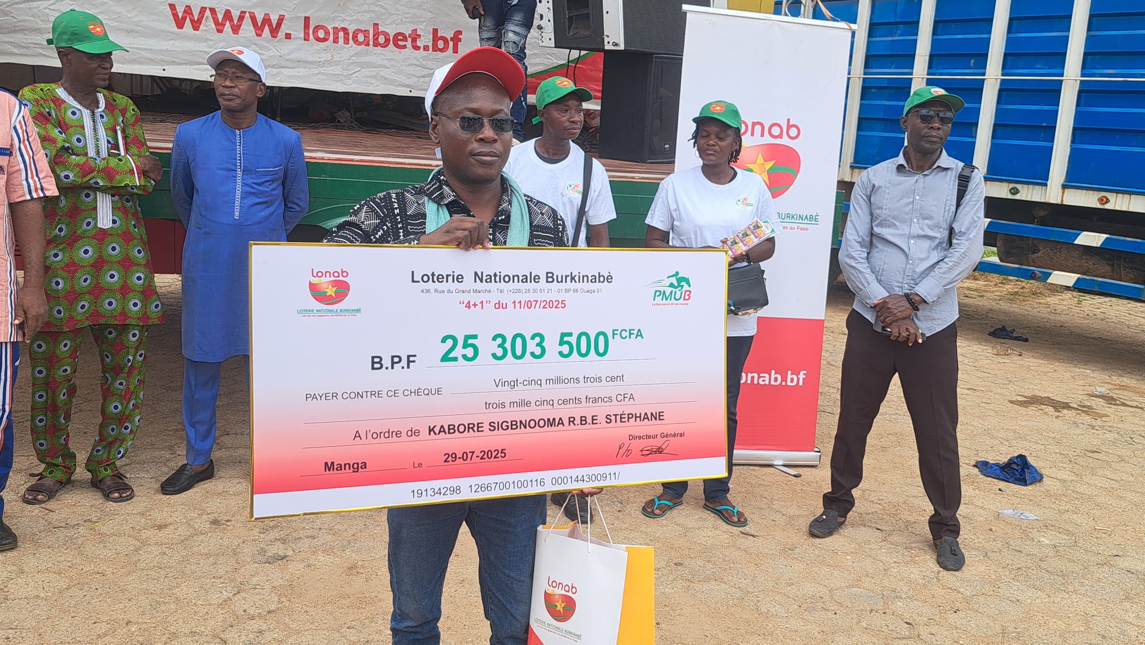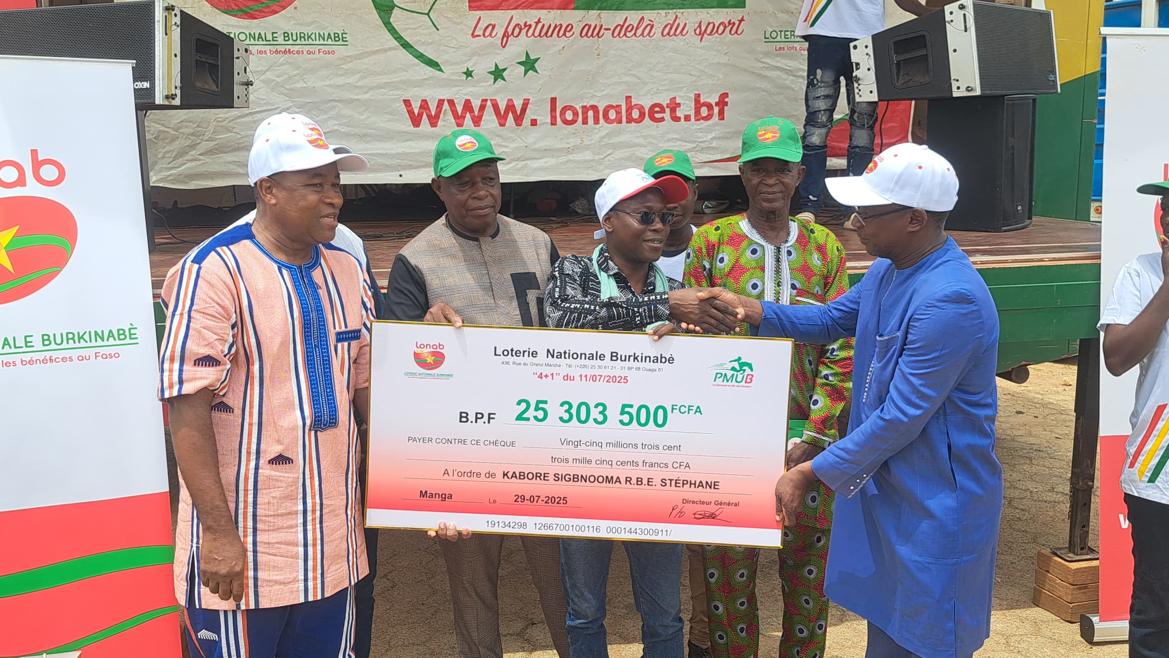 La Loterie Nationale Burkinabè (LONAB) a remis un chèque de 25 303 500 F CFA à Kaboré Sigbnooma R.B.E Stéphane, l’heureux gagnant du « 4+1 » au PMU’B, le mardi 29 juillet 2025. Résident de Koudougou mais originaire de Manga, Monsieur Kaboré a misé la somme de 9 900 F CFA.