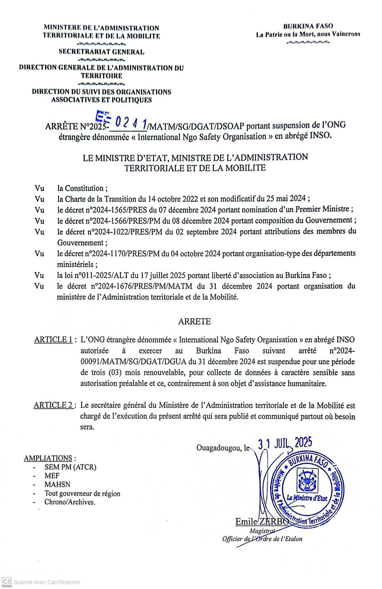 Le gouvernement du Burkina Faso a annoncé le jeudi 31 juillet 2025 la suspension immédiate de l’Organisation Non Gouvernementale (ONG) étrangère « International Ngo Safety Organisation » (INSO). Cette décision, officialisée par l’arrêté ministériel n°2025-E E 024 1/MATM/SG/DGAT/DSOAP, a été prise par le Ministère de l’Administration Territoriale et de la Mobilité.