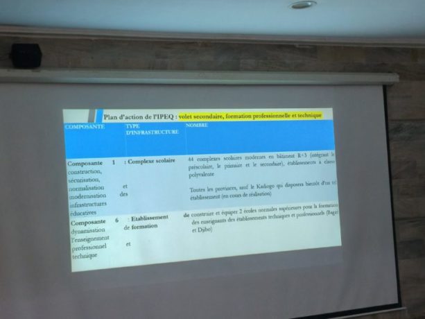 L’IPEQ, a en outre informé l’expert au BN-GPB, poursuit des objectifs stratégiques à savoir changer la forme habituelle des écoles par la construction des édifices à niveau regroupant plusieurs ordres d’enseignement afin de faciliter l’enseignement civique et patriotique ; mettre les Universités aux normes par la construction d’amphithéâtres équipés, de cités universitaires et l’amélioration du cadre de vie et de travail des acteurs du monde éducatif ; valoriser la recherche scientifique pour booster la production et l’expertise locale ; et réduire les inégalités d’accès à l’éducation par une démarche inclusive qui prend en compte tous les enfants du Burkina Faso.