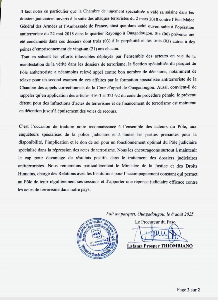 Le communiqué met en lumière la clôture de dossiers emblématiques, notamment ceux ouverts après les attaques du 2 mars 2018 contre l’État-Major général des Armées et l’Ambassade de France, ainsi que l’opération antiterroriste du 22 mai 2018 à Rayongo. Dans ces affaires, six (06) prévenus ont été condamnés, dont trois (03) à la perpétuité et trois (03) autres à vingt-et-un (21) ans de prison.