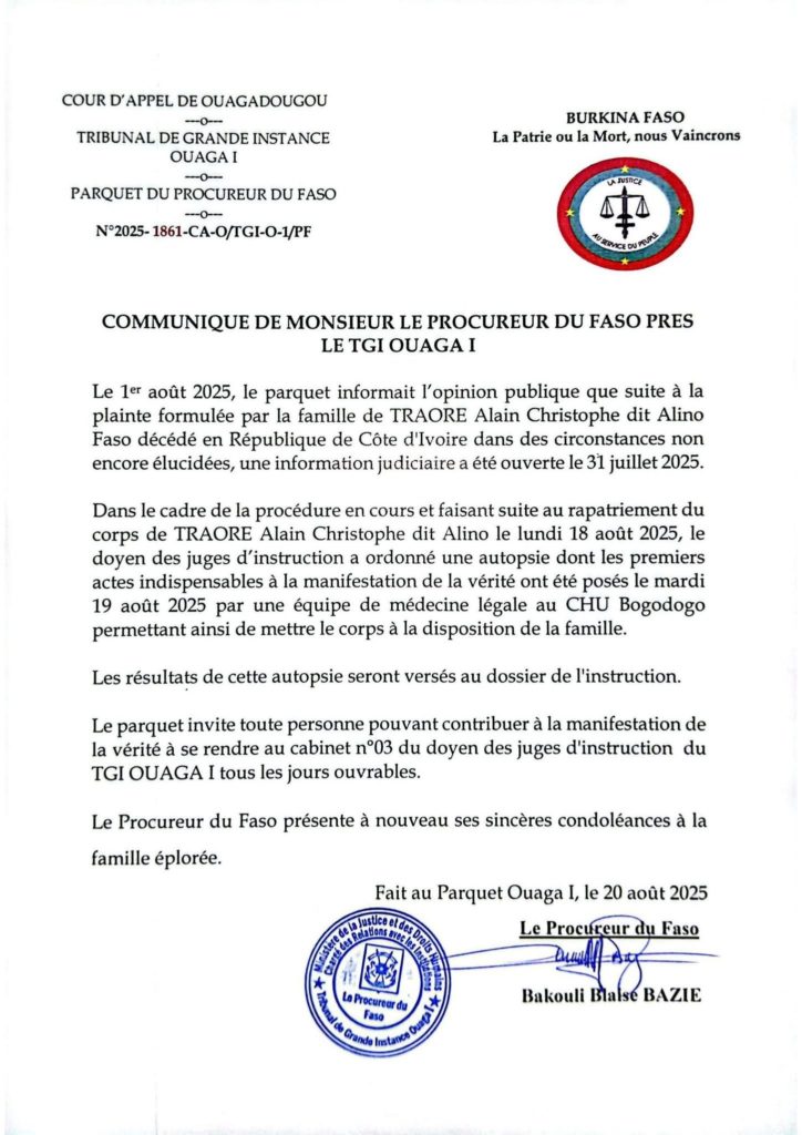 Selon un communiqué signé le 20 août 2025 par le procureur du Faso près le TGI Ouaga I, Bakouli Blaise Bazié, cette décision fait suite à une plainte introduite par la famille du défunt. L’information judiciaire a été ouverte depuis le 31 juillet 2025.