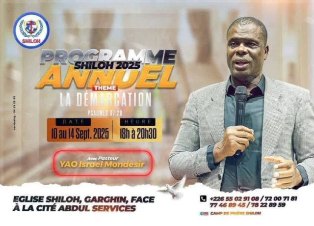 Un seul lieu : Camp De Prière Shiloh. Nous sommes situés vers l’hôpital Blaise Compaoré plus précisément à Kamsontinga en face de la cité Abdoul Services.