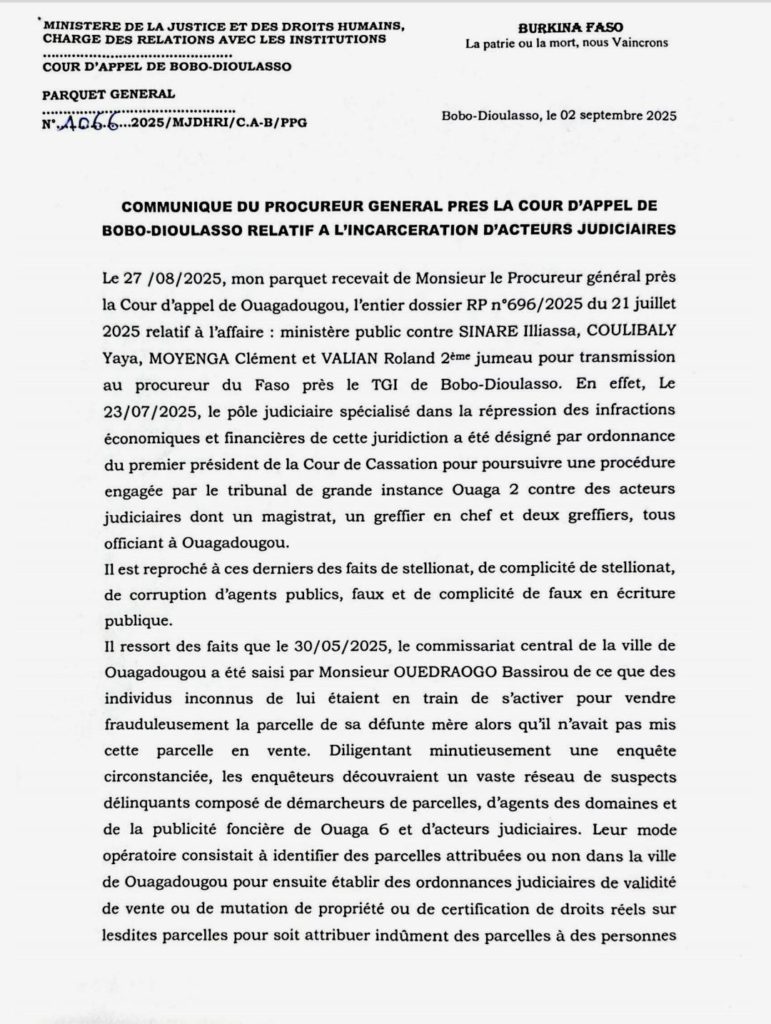 Le Procureur général près la Cour d’appel de Bobo-Dioulasso a annoncé l’incarcération de plusieurs acteurs judiciaires impliqués dans une vaste affaire de fraude foncière et de corruption à Ouagadougou.