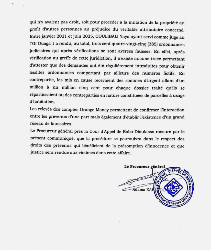 Selon le communiqué officiel, le dossier, initialement instruit par la Cour d’appel de Ouagadougou, a été transmis au pôle judiciaire spécialisé du Tribunal de grande instance de Bobo-Dioulasso. Quatre personnes sont concernées : Illiassa Sinare, Yaya Coulibaly, Clément Moyenga et Roland Valian (2e jumeau). Parmi elles figurent un magistrat, un greffier en chef et deux greffiers.